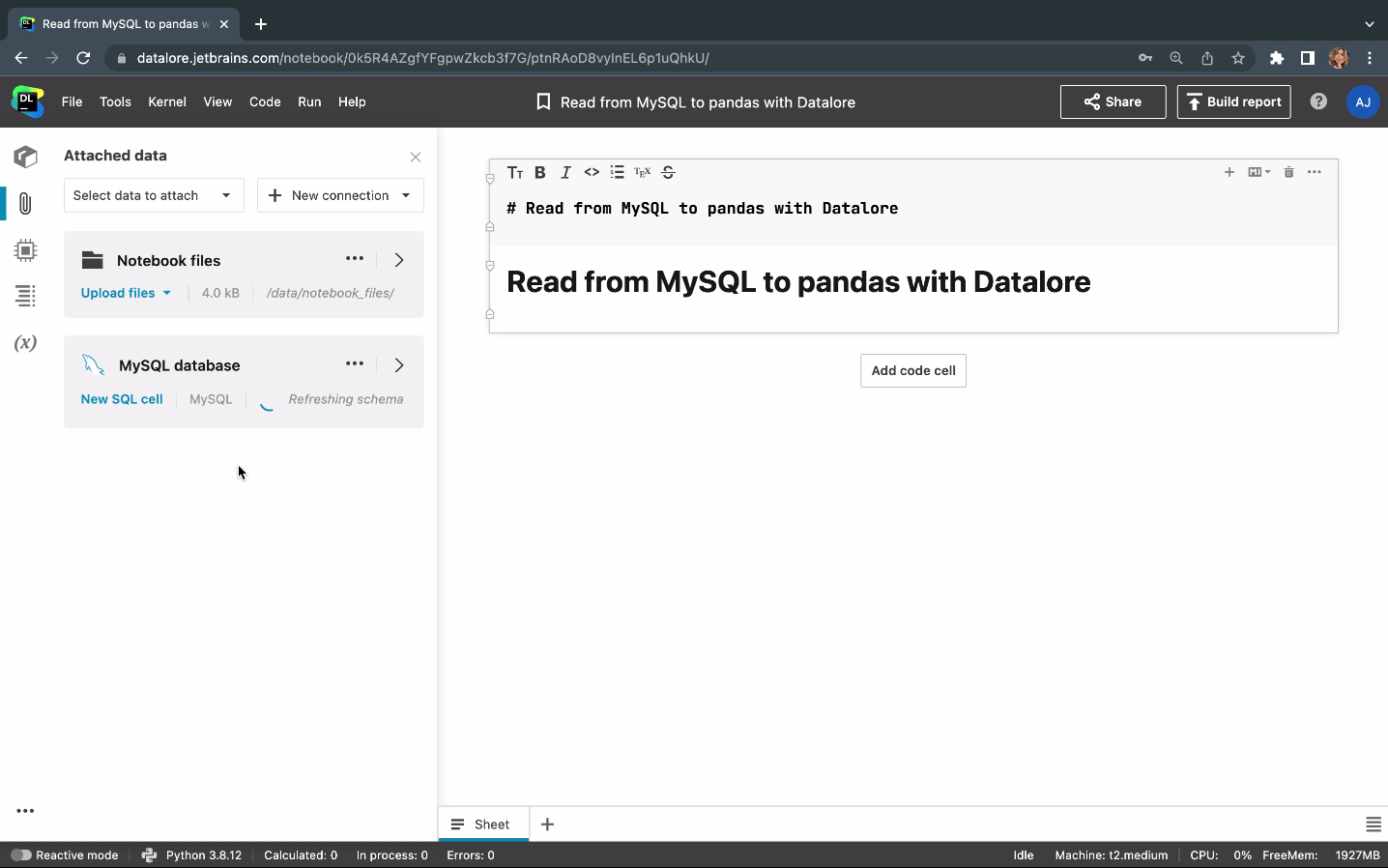 Luckily, you can automate this workflow with Datalore, a collaborative data science platform from JetBrains that offers a variety of data integrations, including MySQL.